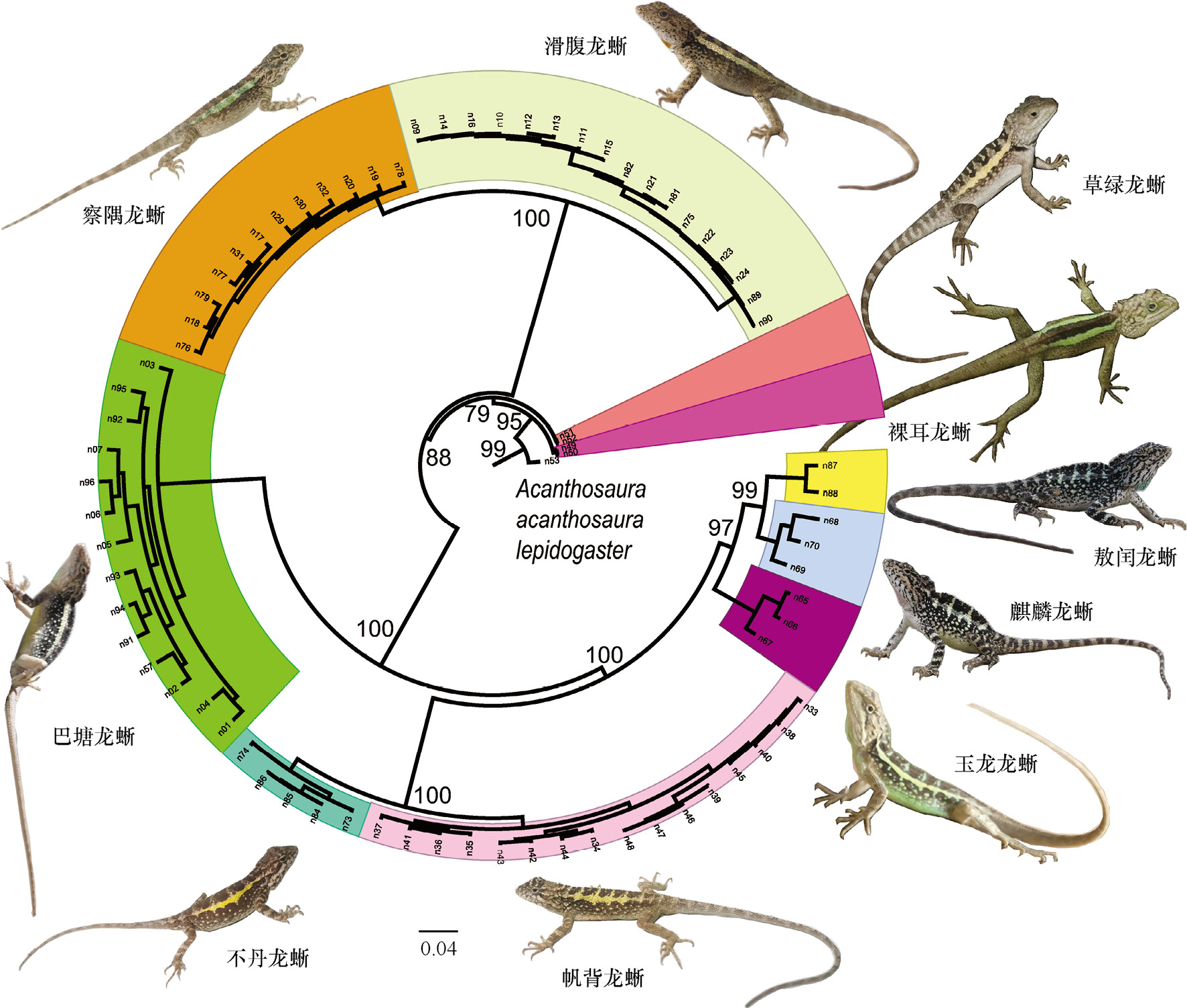 全球变化背景下,物种受威胁等级评估是生物多样性监测和保护工作中至关重要的环节。IUCN红色名录作为目前最权威、应用最广泛的物种受威胁信息来源,其评估标准却忽视了遗传多样性、气候和土地利用变化等对物种未来存续至关重要的因素,导致误判物种受威胁状况,阻碍针对性保护措施制定。为弥补上述不足,两栖爬行动物多样性监测专项网开展了基于翔实野外调查数据的统计方法技术攻关,通过结合有效种群大小、物种栖息地面积变化等关键因素,提出并优化了物种受威胁等级评估框架,并以分布于青藏高原的10个具有重要生态功能的龙蜥属(Diploderma)物种为测试对象,对新框架的有效性进行了验证(图3-47)。